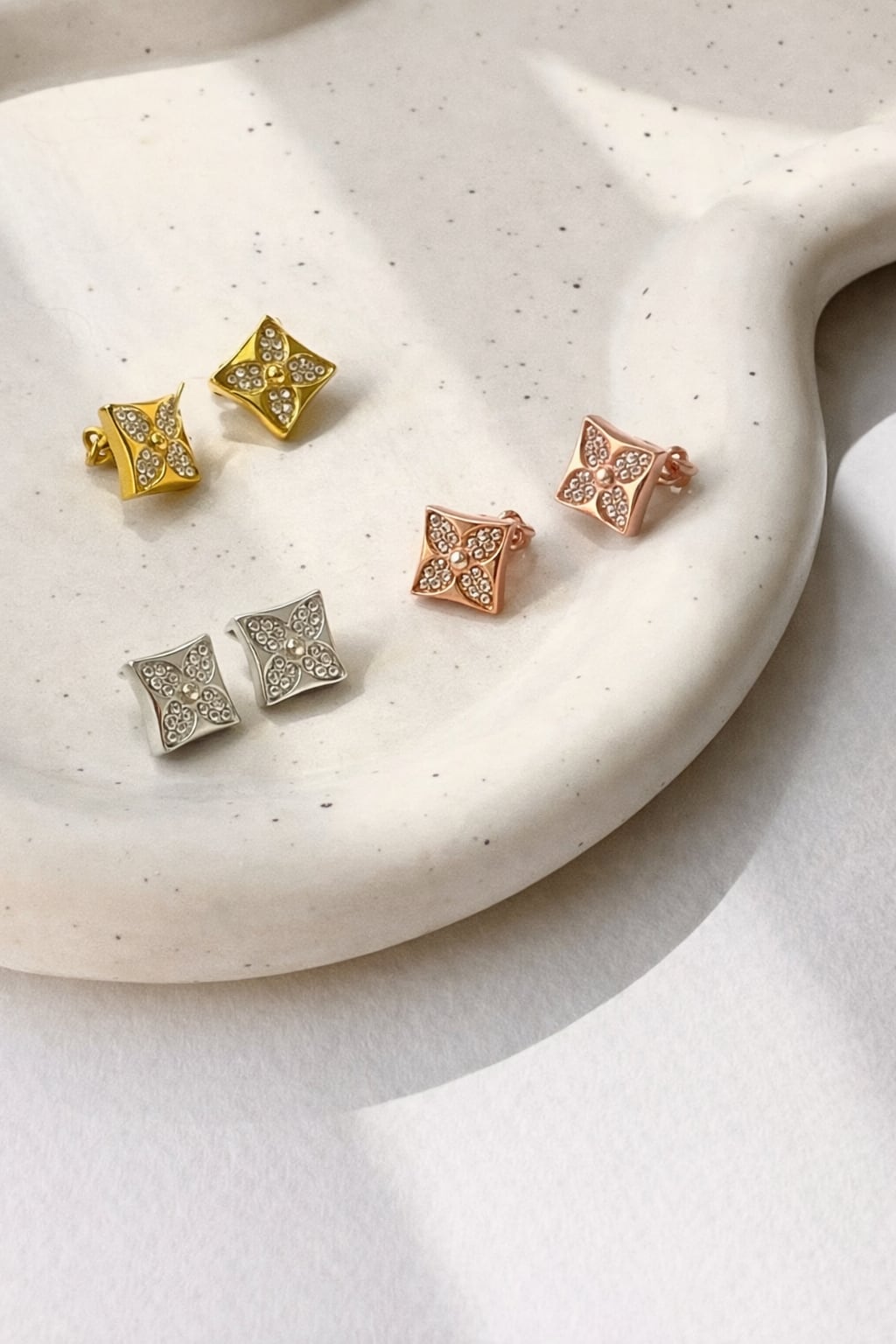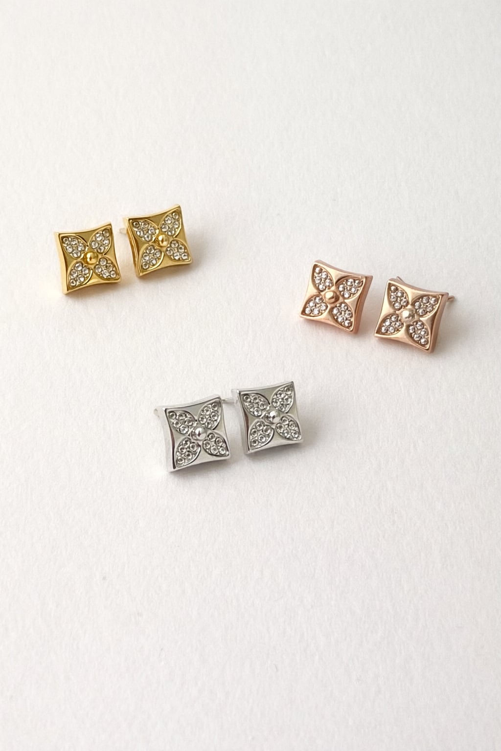 小さなスクエアにきらめくビジューを配置した